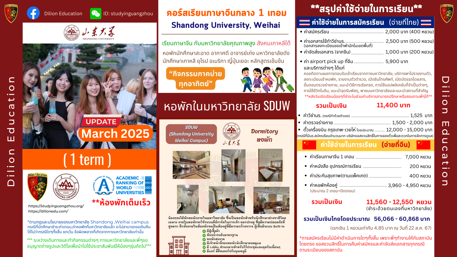 Dilion Education ตัวแทนอย่างเป็นทางการ ของมหาวิทยาลัยและสถาบันชั้นนำของประเทศจีนและฟิลิปปินส์ บริการแบบครบวงจร ตั้งแต่ให้คำปรึกษา ตรวจเอกสาร จองตั๋วและที่พัก และอื่นๆ ไปจนถึงการบริการเสริมอื่นๆ บริษัทของเรามีประสบการณ์ด้านการศึกษามานานกว่า 11 ปี การันตีโดยผู้เคยเข้าร่วมโครงการกว่าพันราย^^